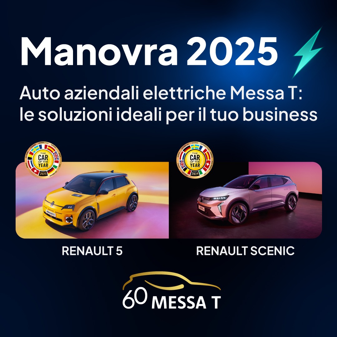 Sappiamo che le auto aziendali sono strumenti indispensabili per le imprese; noi di Messa T siamo qui per guidarti con professionalità nelle scelte che riguardano la tua flotta aziendale. La nostra gamma Renault E-Tech 100% Electric è il vantaggio ideale per sfruttare al meglio le agevolazioni fiscali della nuova manovra finanziaria; il 2025 è infatti il momento giusto per scegliere le auto elettriche!